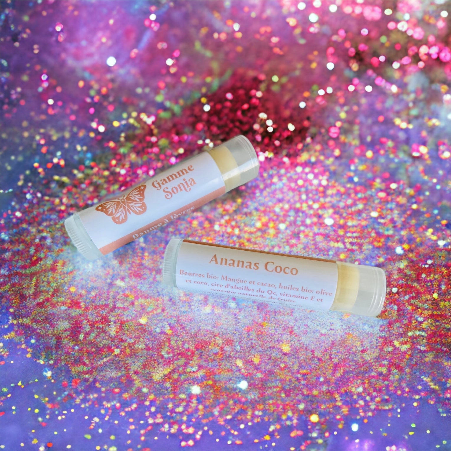 Beurres bio: Mangue et cacao, huiles bio: olive et coco, cire d'abeilles du Qc, vitamine E et saveurs naturelles.