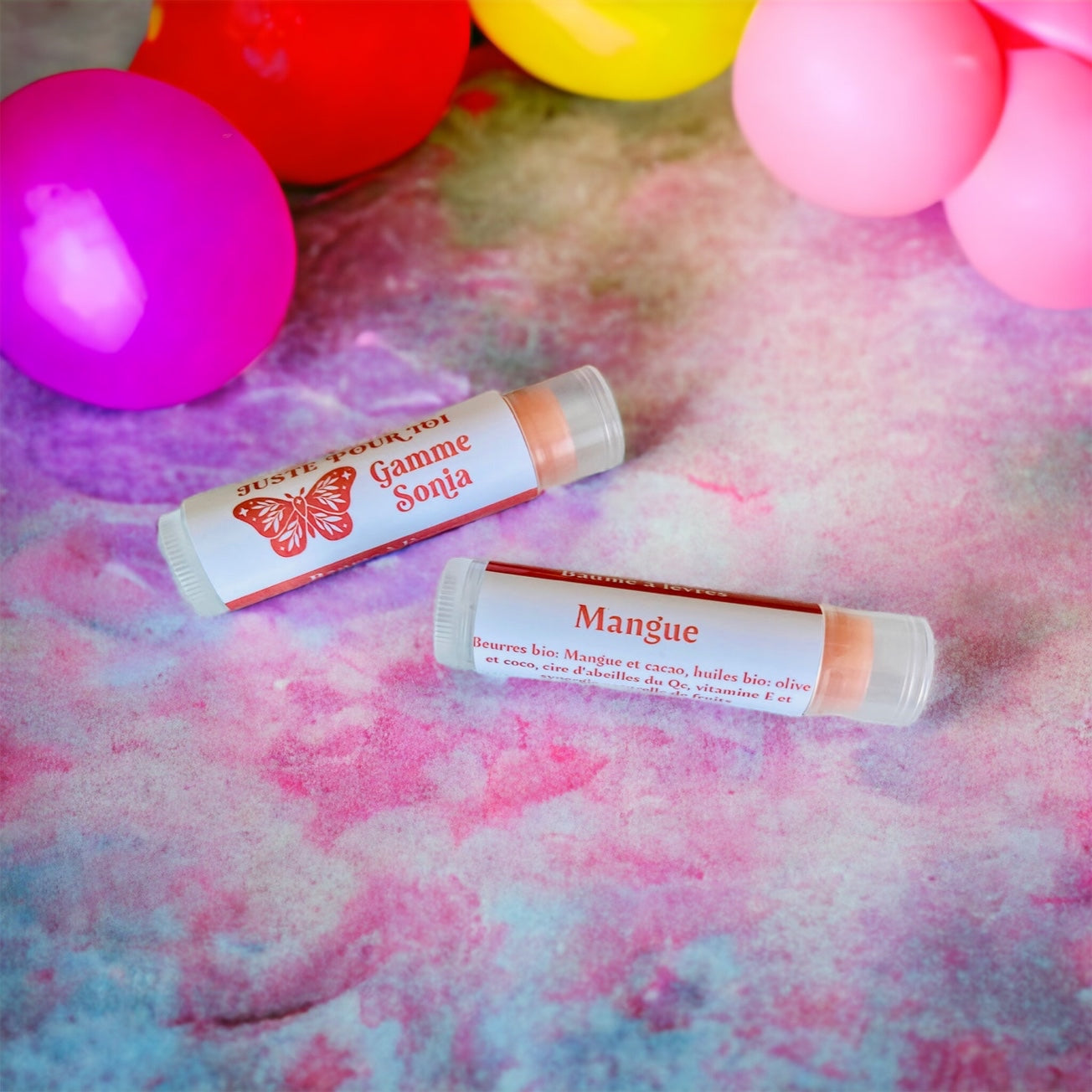 Beurres bio: Mangue et cacao, huiles bio: olive et coco, cire d'abeilles du Qc, vitamine E et saveur naturelle mangue.
