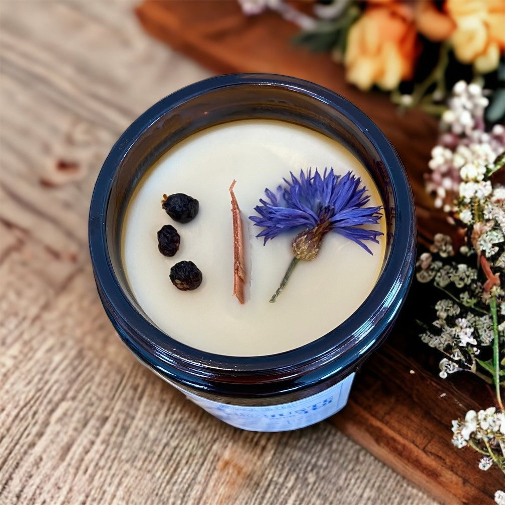 Chaque bougie est exclusive et décorée selon les fleurs et plantes médicinales disponibles en inventaire. Votre bougie peut donc être différente de celle représenté sur la photo.