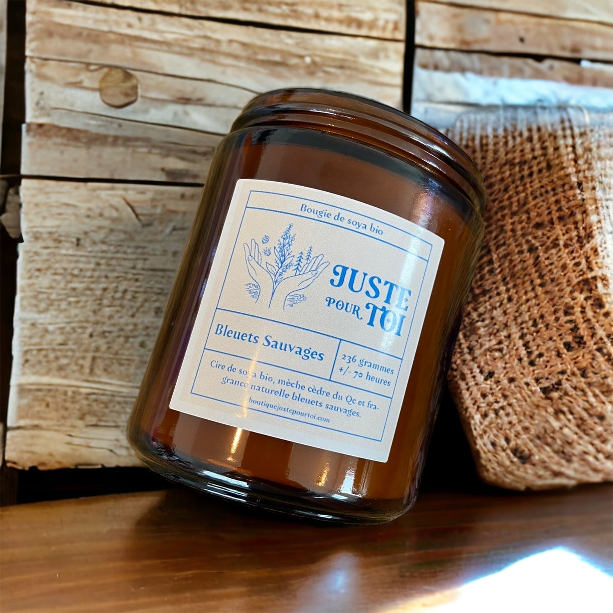 Ingrédients:Cire de soya bio, mèche cèdre du Qc et fragrance naturelle bleuets sauvages.