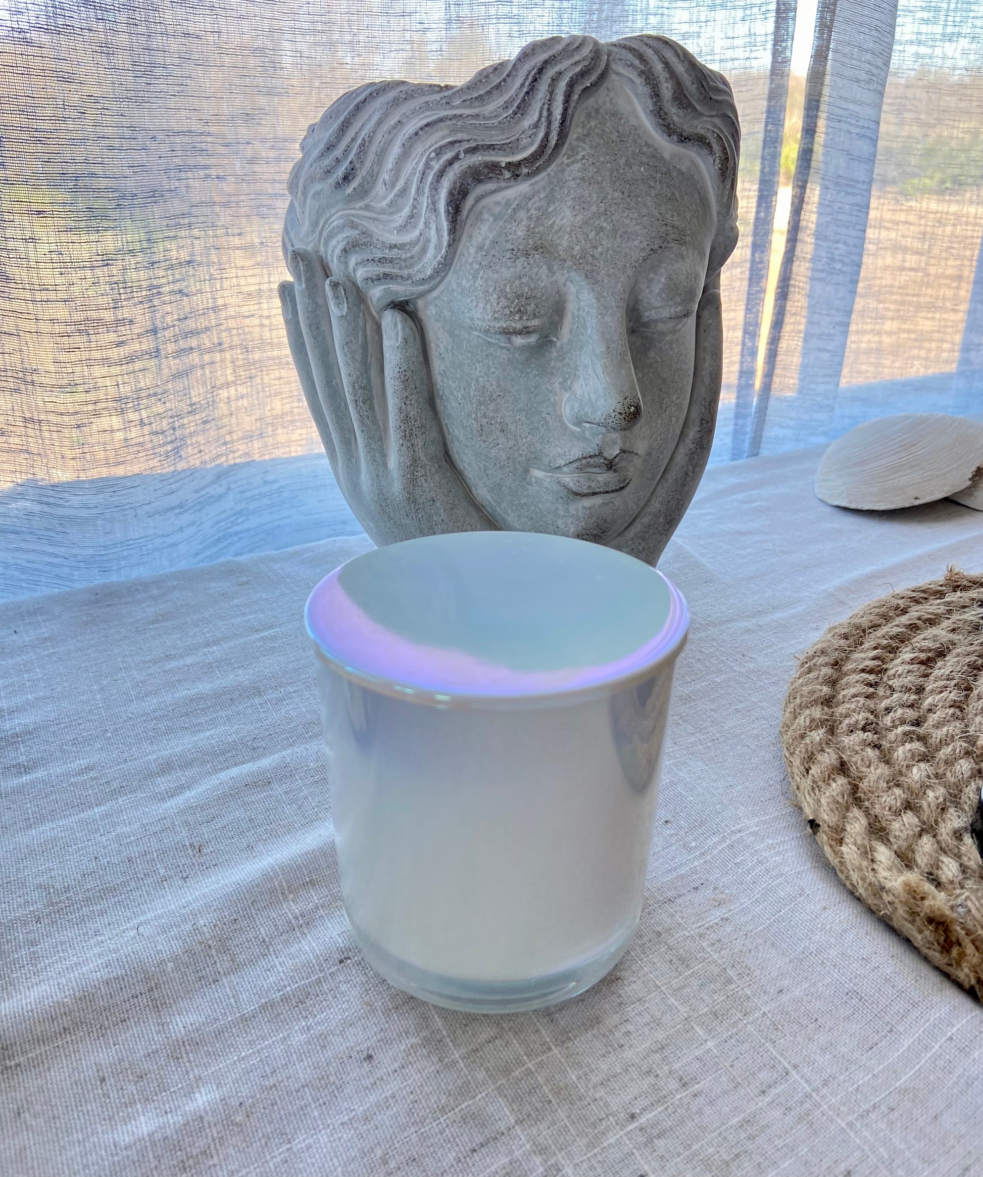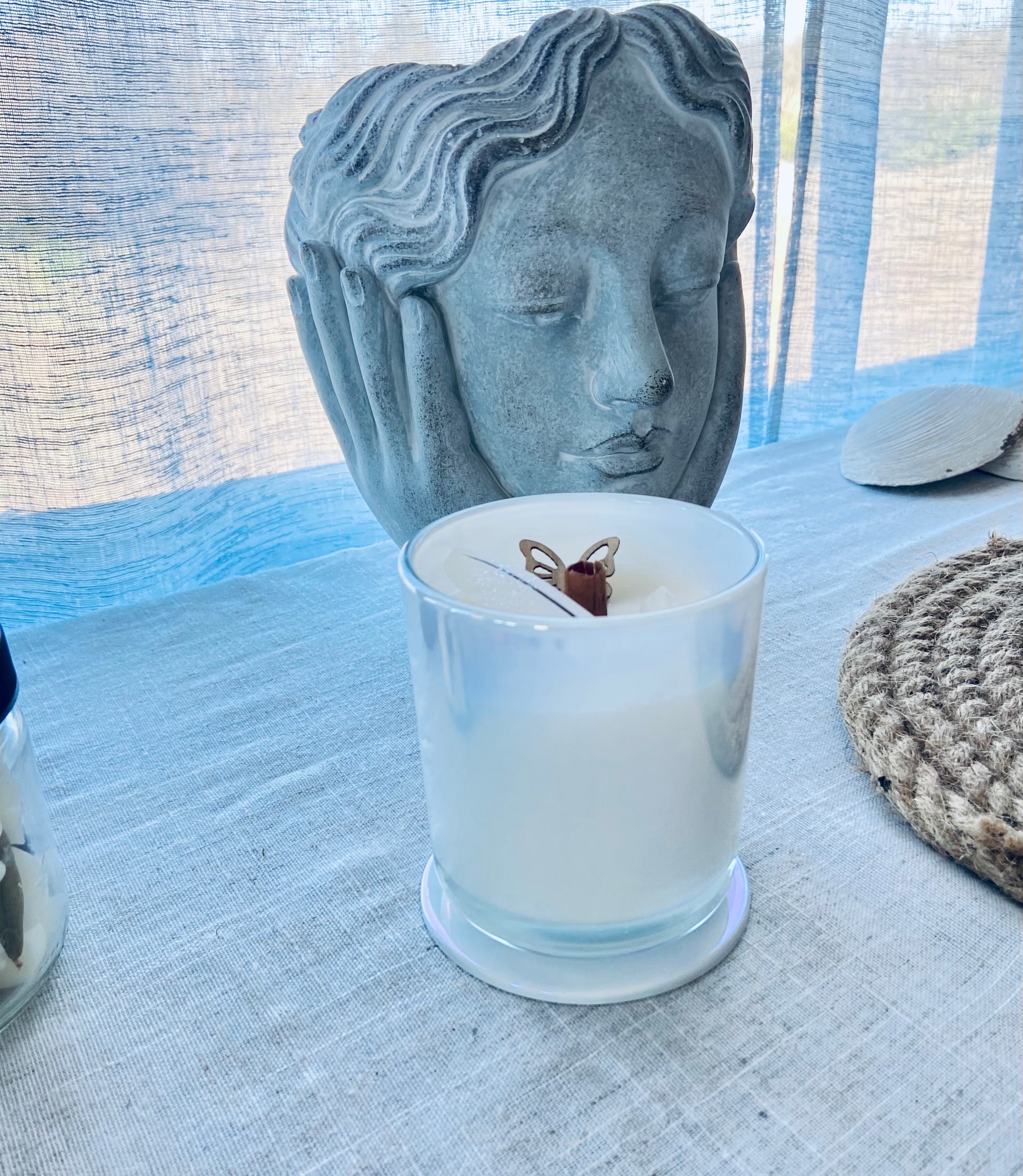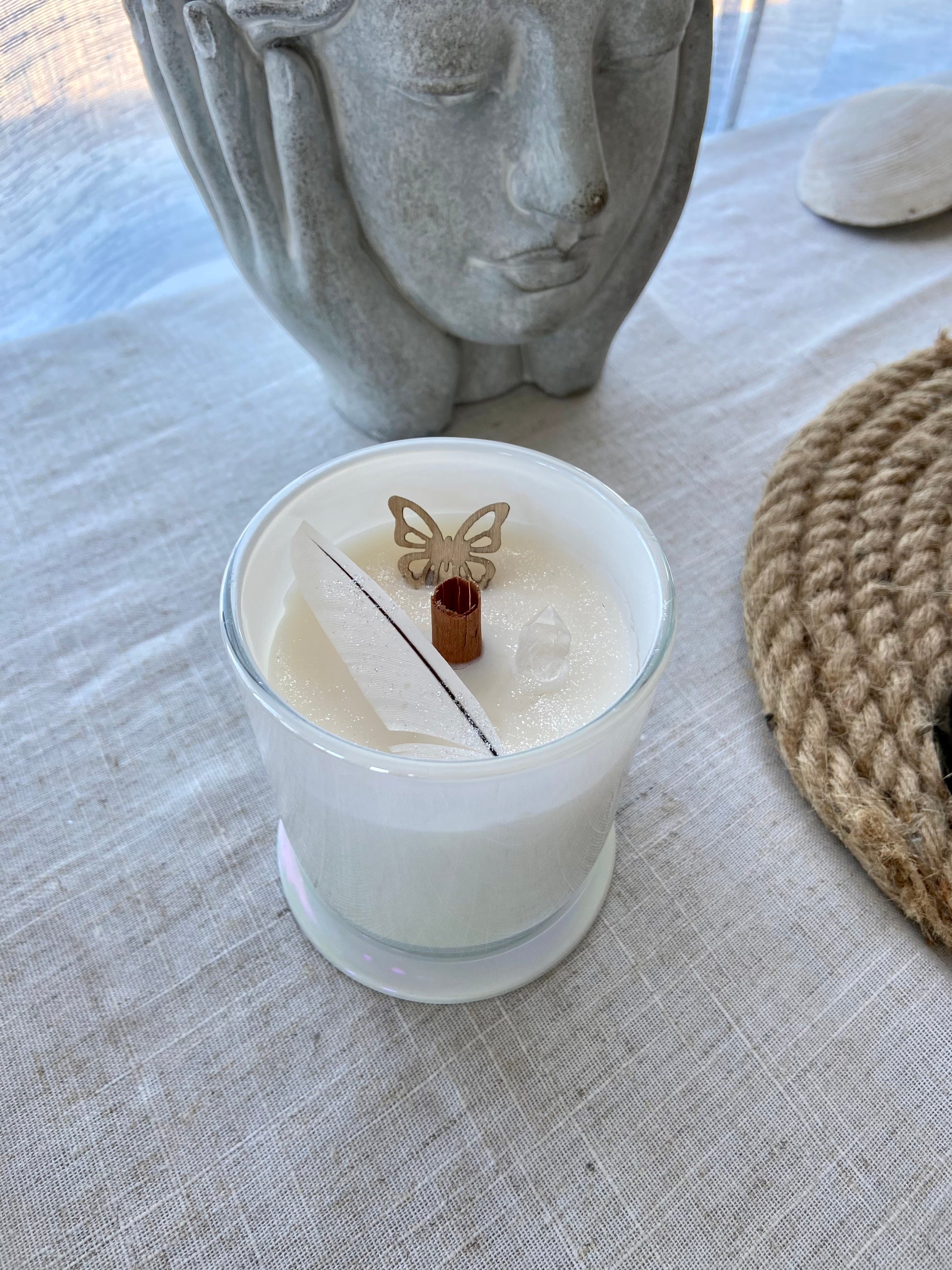 Chaque bougie est exclusive et décorée selon les fleurs et plantes médicinales, des cristaux disponibles en inventaire. Votre bougie peut donc être différente de celle représenté sur la photo.