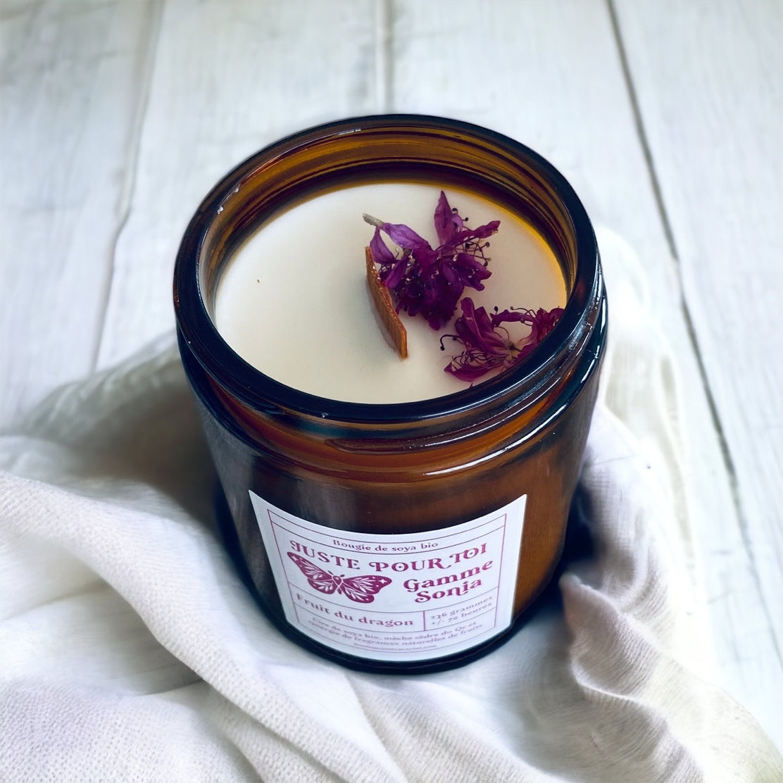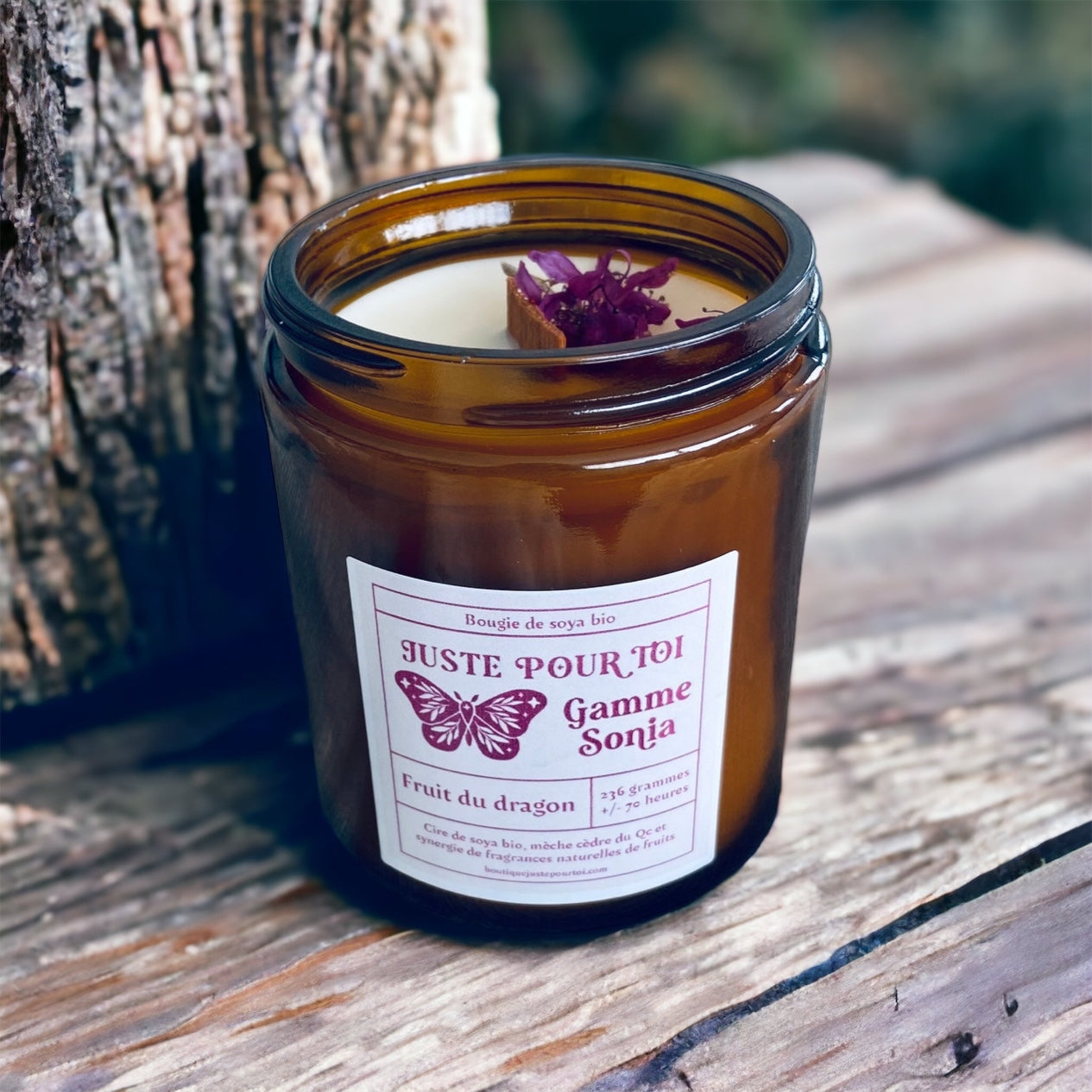 Découvrez la bougie fruit du dragon de soya biologique avec mèche de bois du Québec, une expérience olfactive exquise qui vous transportera dans un jardin tropical luxuriant. Fabriquée à partir de cire de soya biologique, cette bougie respecte l'environnement tout en offrant une combustion propre et durable.
