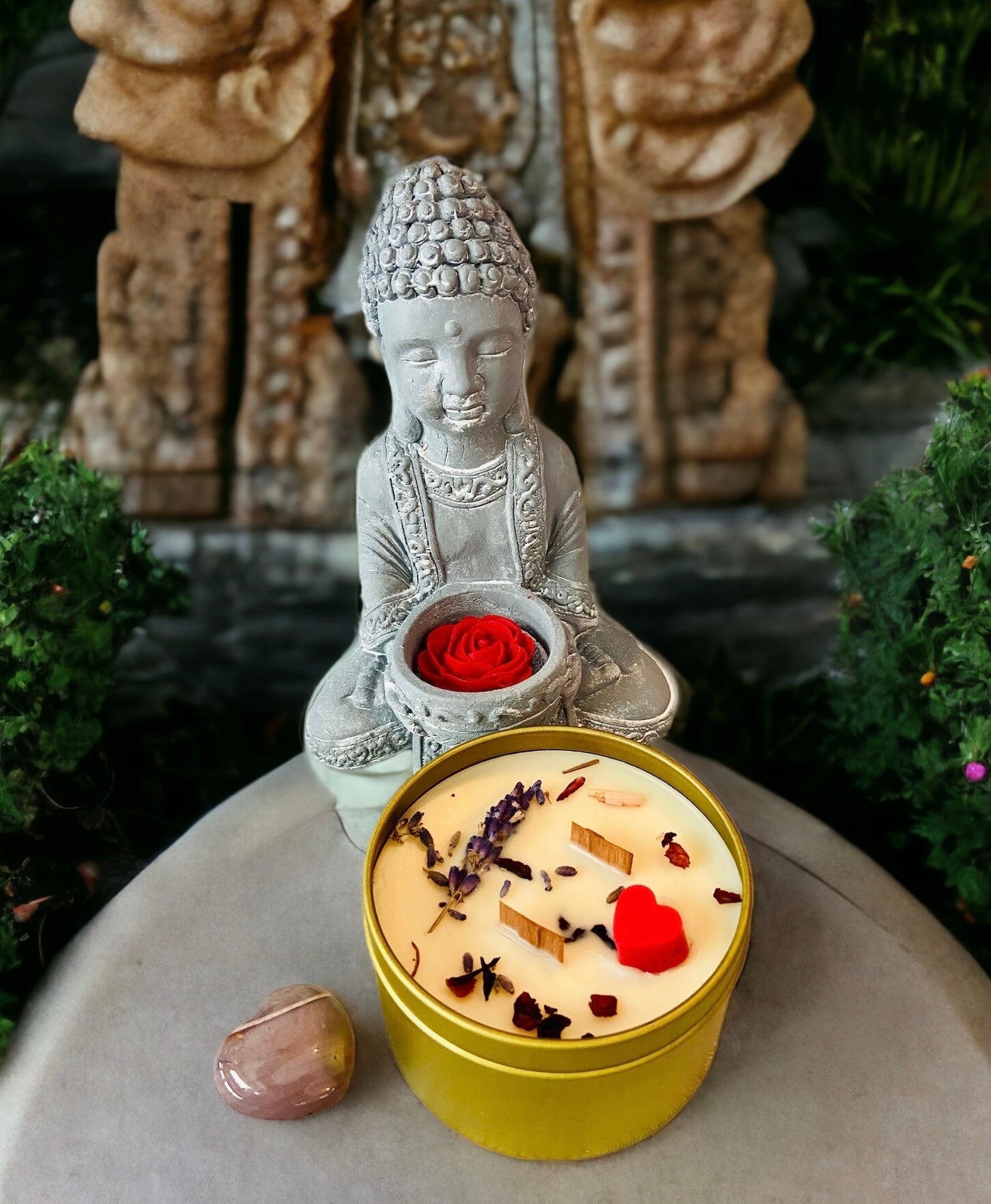 Chaque bougie est exclusive et décorée selon les fleurs et plantes médicinales disponibles en inventaire. Votre bougie peut donc être différente de celle représenté sur la photo.