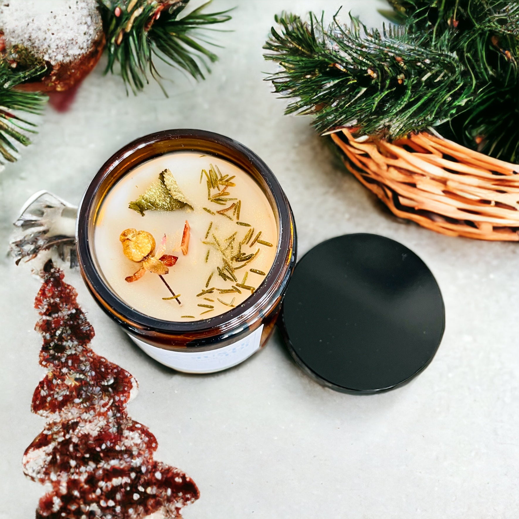 Ingrédients: Cire de soya biologique, mèches de cèdre du Québec et synergie d'huiles essentielles bio pin et fragrances naturelles de pêche. +-70hrs