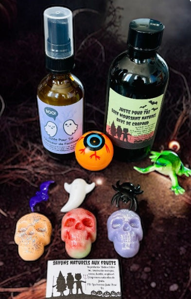 Le soir de l'Halloween après la cueillette de bonbons, transformer l'heure du bain en un moment enchanté avec notre Ensemble pour le bain Bave de Crapaud conçu spécialement pour les enfants !