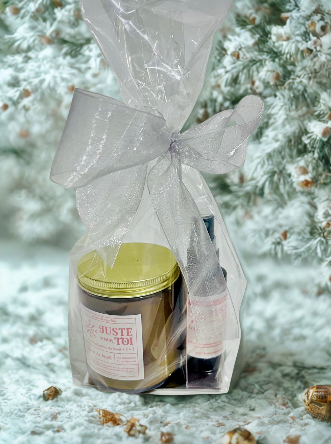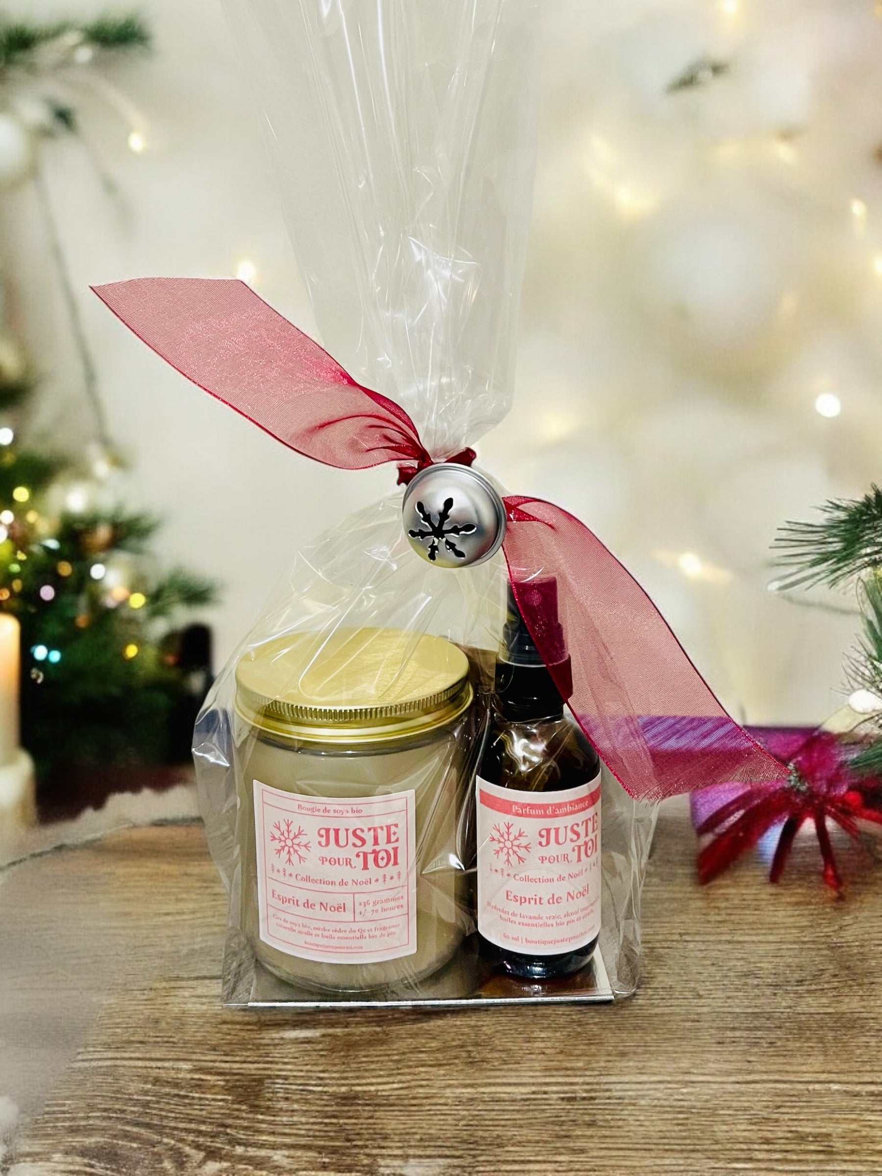 L'ensemble Esprit de Noël comprend: Une bougie de soya de 70hrs de diffusion d'aromathérapie ainsi qu'un parfum d'ambiance de 60 ml.