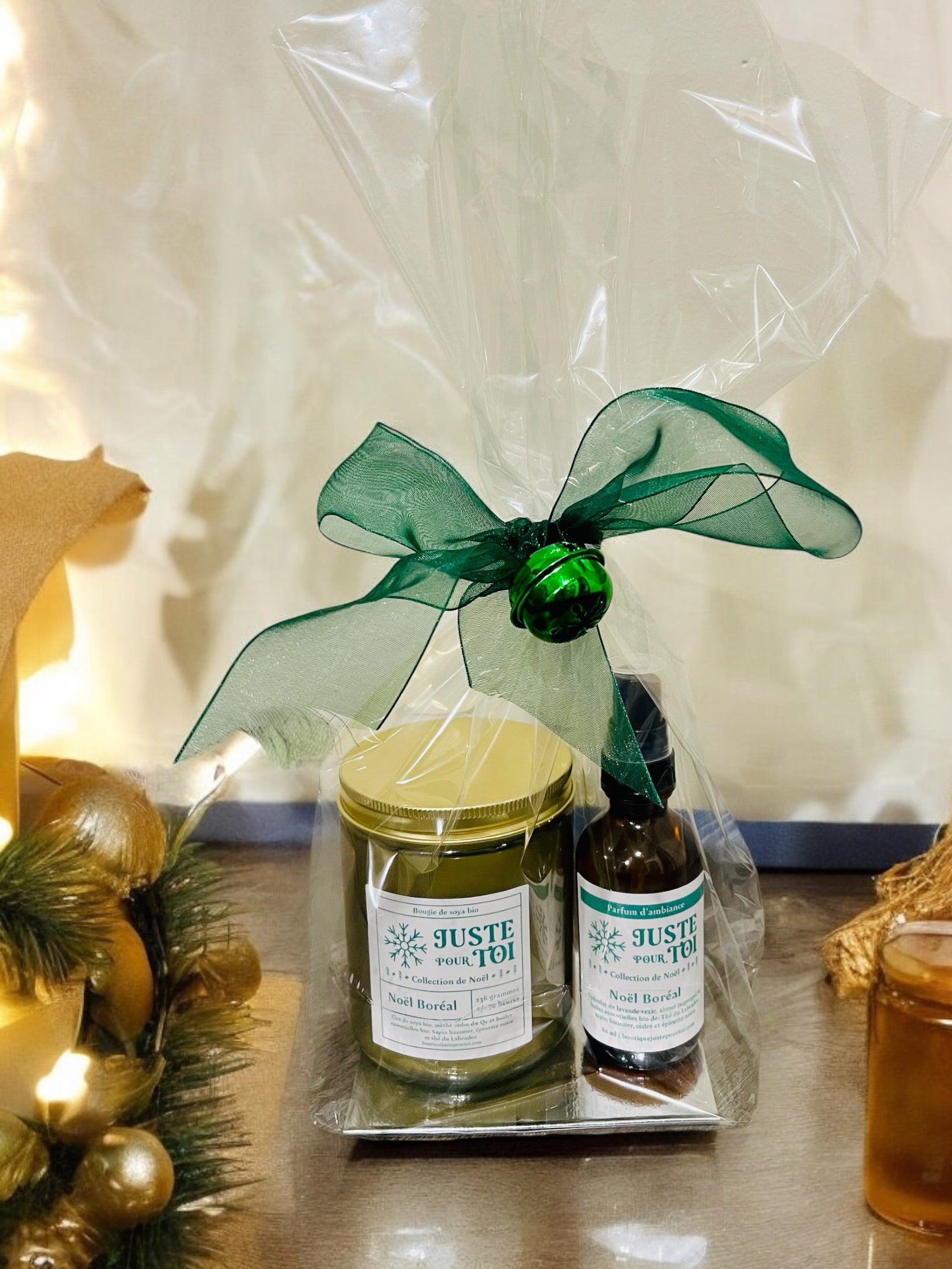 Cet ensemble cadeau comprend une bougie de soya bio Noël Boréal qui procure 70hrs d'aromathérapie ainsi qu'un parfum d'ambiance Noël Boréal de 60 ml.