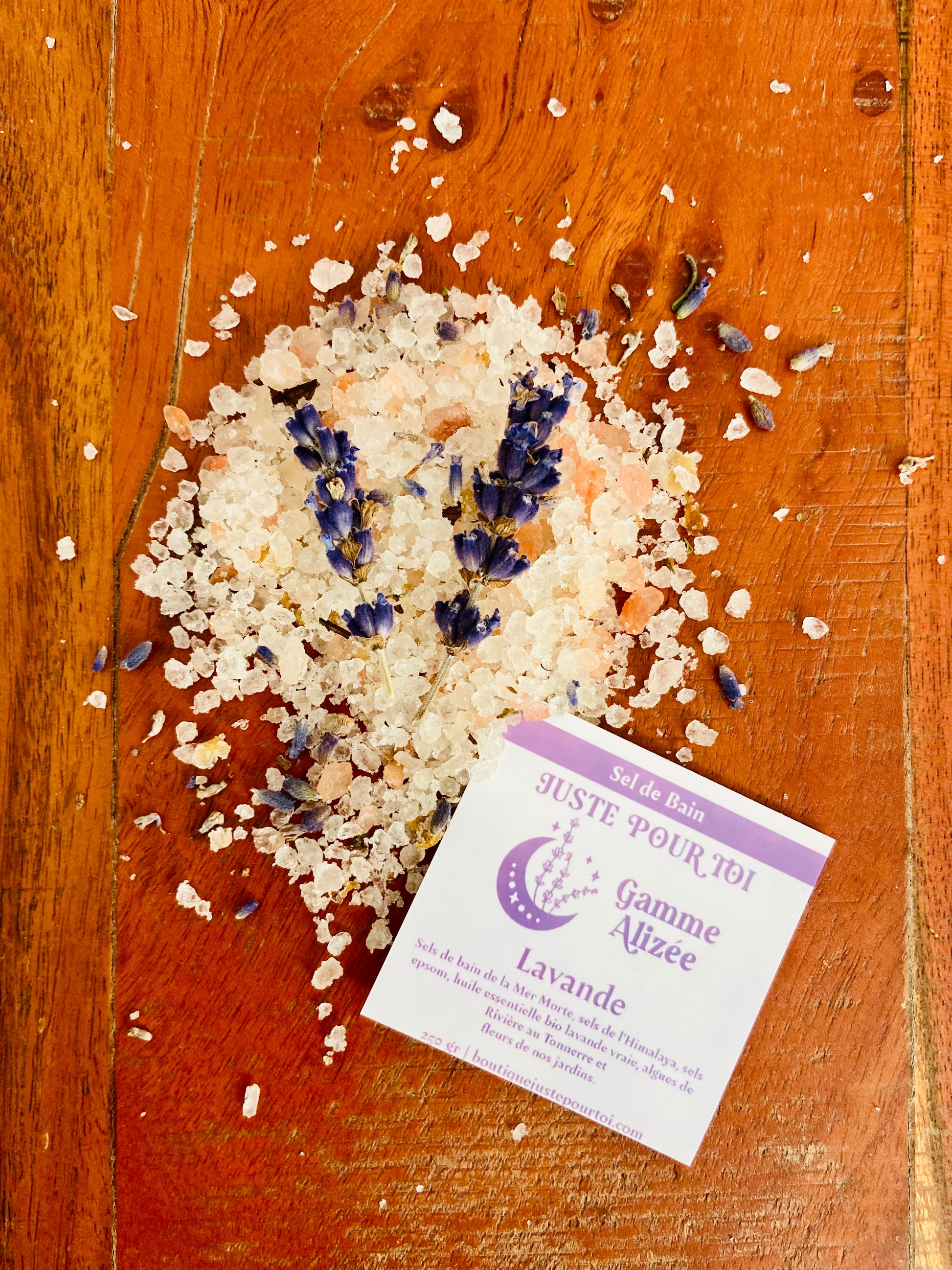 Sels de bain de la Mer Morte, sels de l'Himalaya, sels epsom, huile essentielle bio lavande vraie, algues de Rivière au Tonnerre et fleurs de nos jardins.