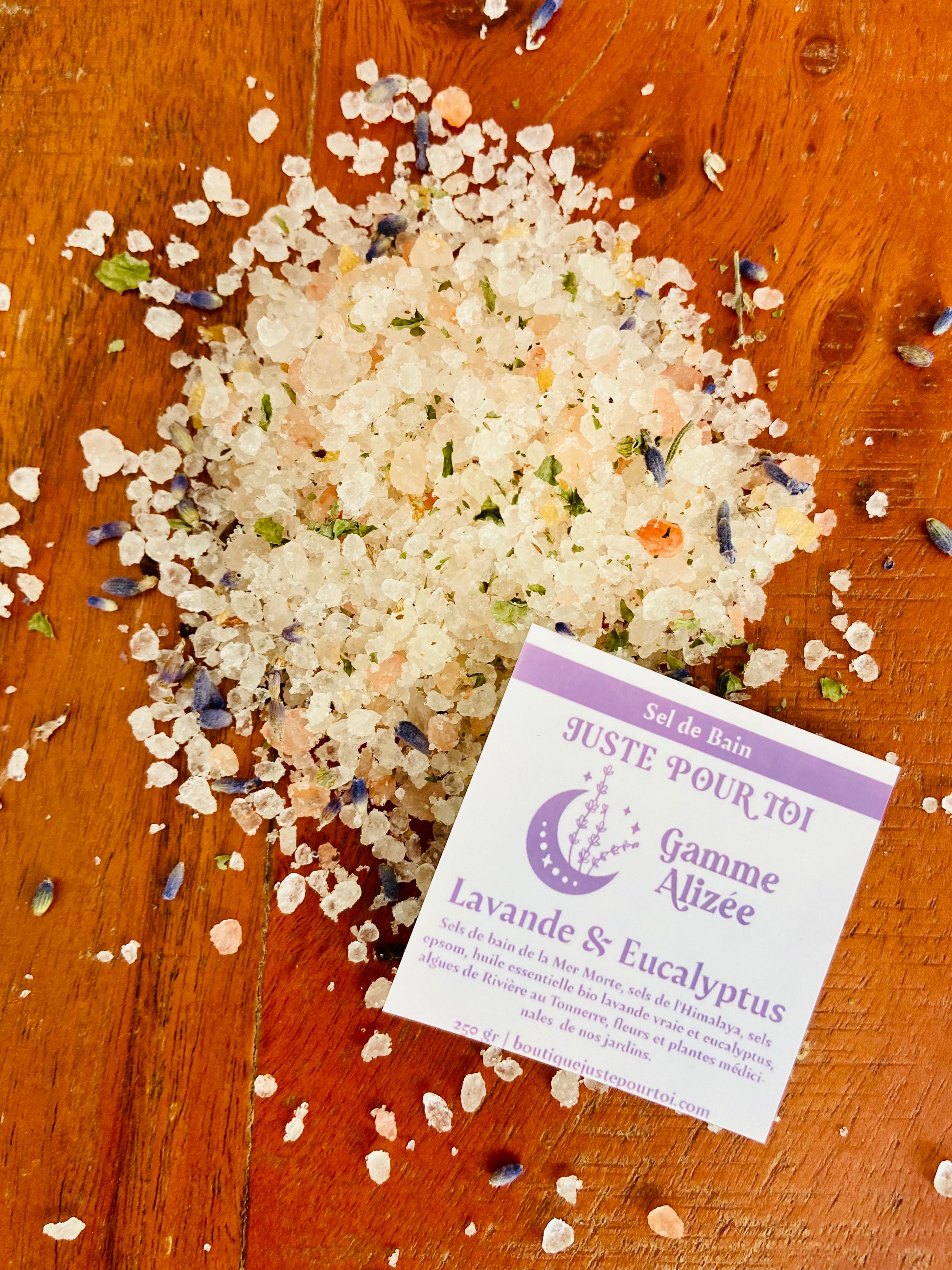 Sels de bain de la Mer Morte, sels de l'Himalaya, sels epsom, huile essentielle bio lavande vraie et eucalyptus, algues de Rivière au Tonnerre, fleurs et plantes médicinales de nos jardins.