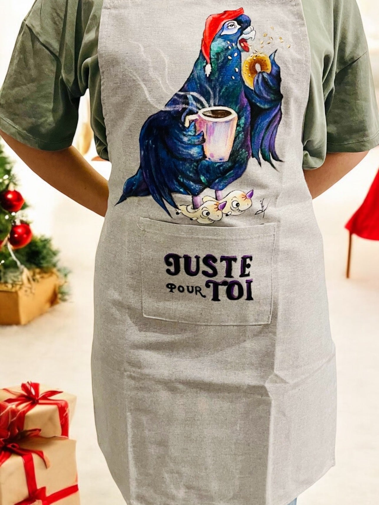 Tablier exclusif Juste Pour Toi peint à la main par une artiste et 100% lavable.