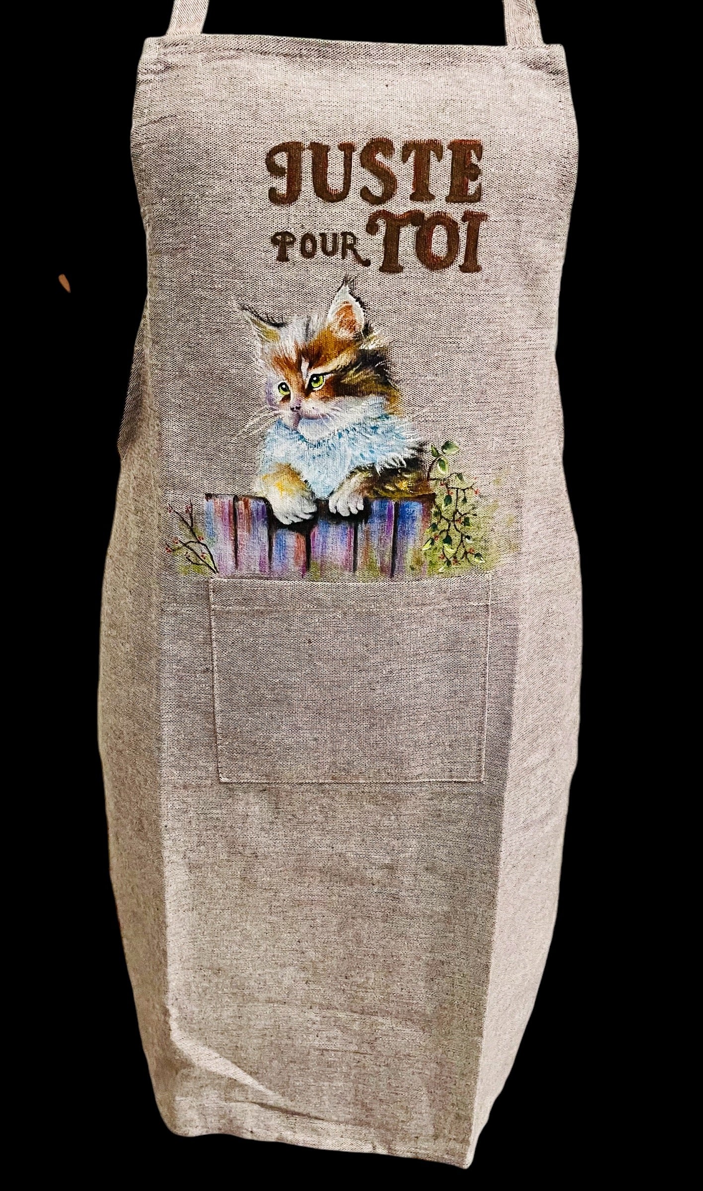 Tablier exclusif Juste Pour Toi peint à la main par une artiste et 100% lavable.